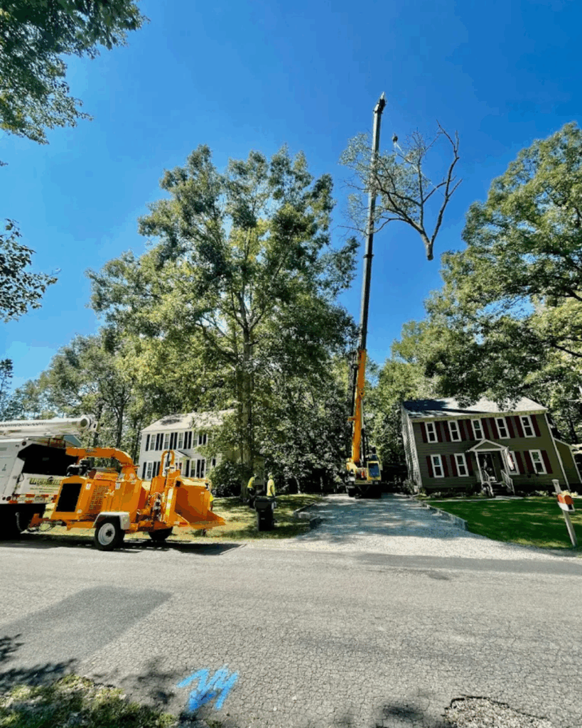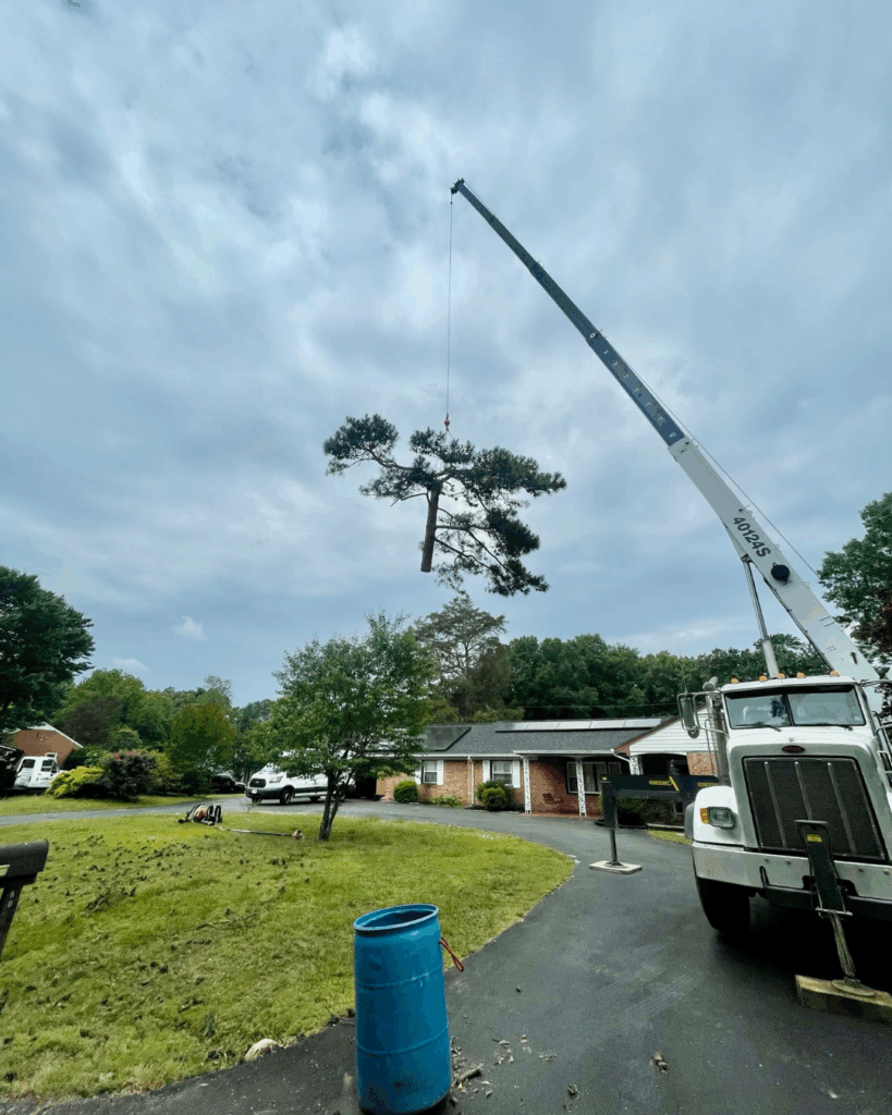 Crane-assisted removal is often the safest and most efficient option for large or compromised trees. It minimizes ground impact and ensures controlled dismantling — critical in tight spaces or residential neighborhoods.